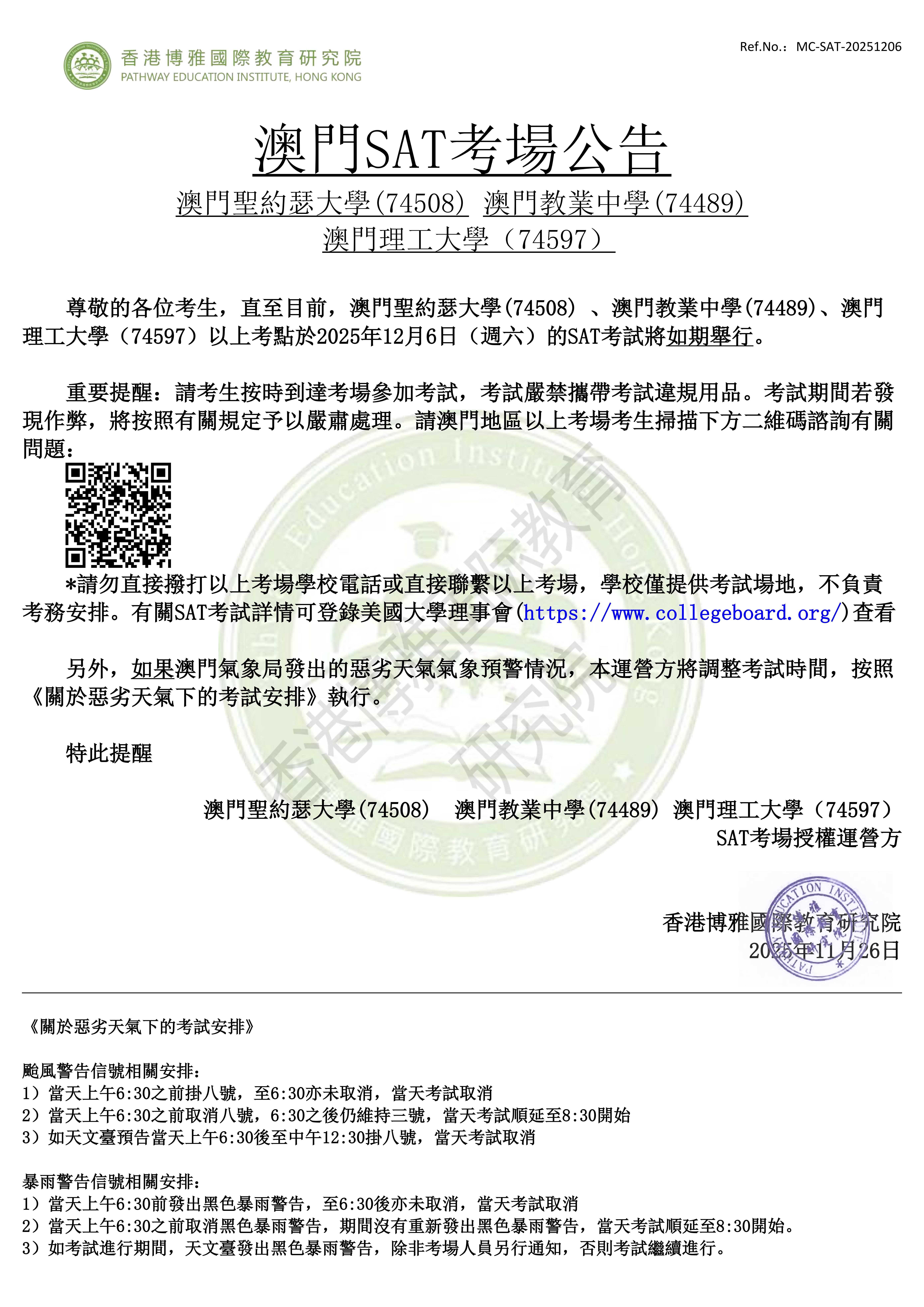 尊敬的各位考生,直至目前,澳門聖約瑟大學(74508) 、澳門教業中學(74489)、澳門理工大學(74597)以上考點於2025年12月6日(周六)的SAT考試將如期舉行。